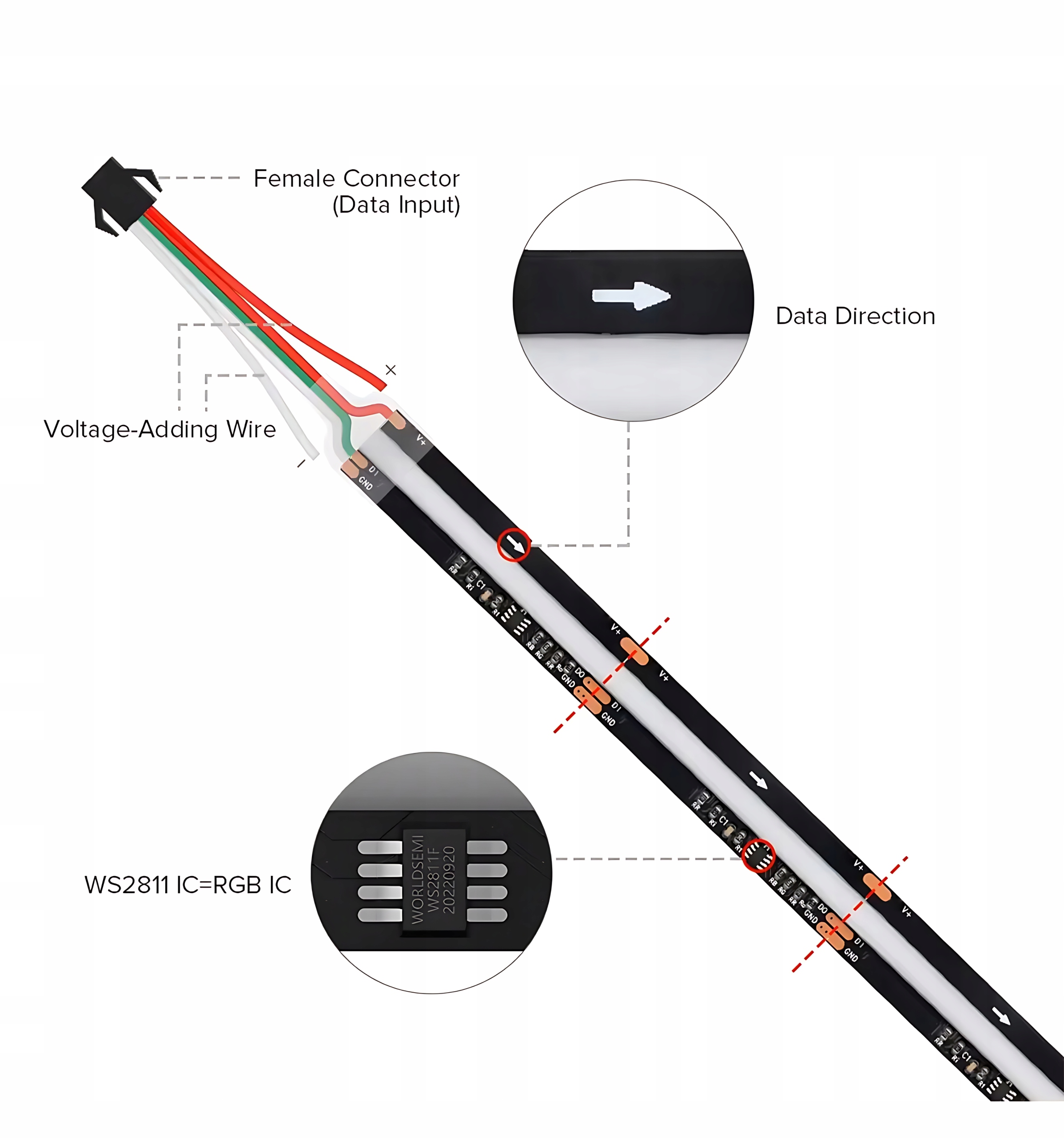 Sterowanie odbywa się poprzez popularne kontrolery kompatybilne z WS2811 (Arduino, ESP32, Raspberry Pi, WLED). Zasilanie 12V gwarantuje stabilną pracę nawet przy dłuższych odcinkach.