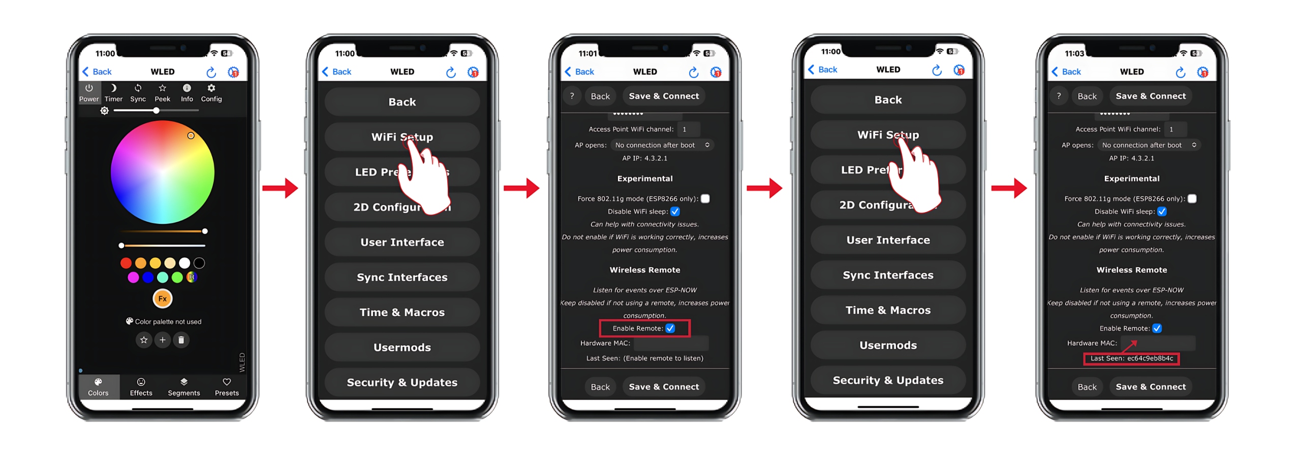 Wróć do panelu konfiguracyjnego WLED w przeglądarce. Ponownie przejdź do „Config" → „WiFi Setup" i znajdź sekcję „ESP-NOW Wireless". W polu „Last device Seen" (Ostatnio wykryte urządzenie) pojawi się unikalny numer (adres MAC) Twojego pilota (w formacie np. AA:BB:CC:DD:EE:FF).