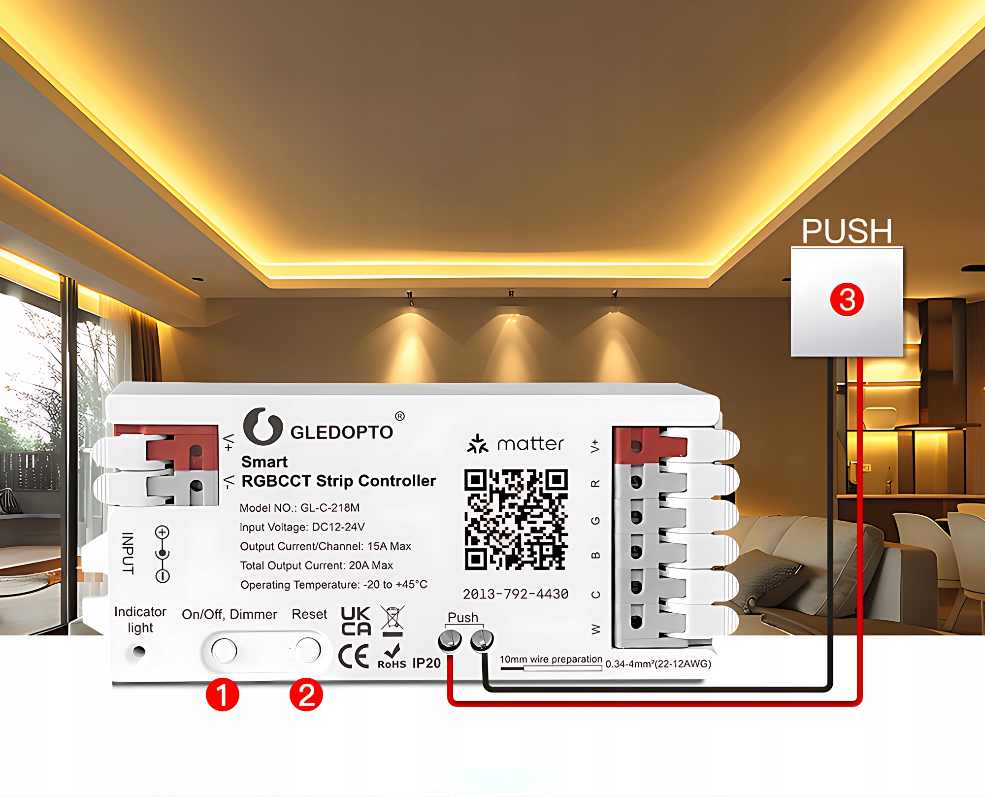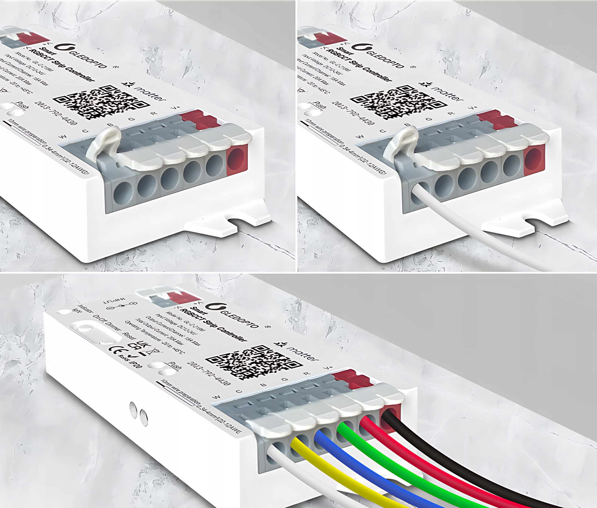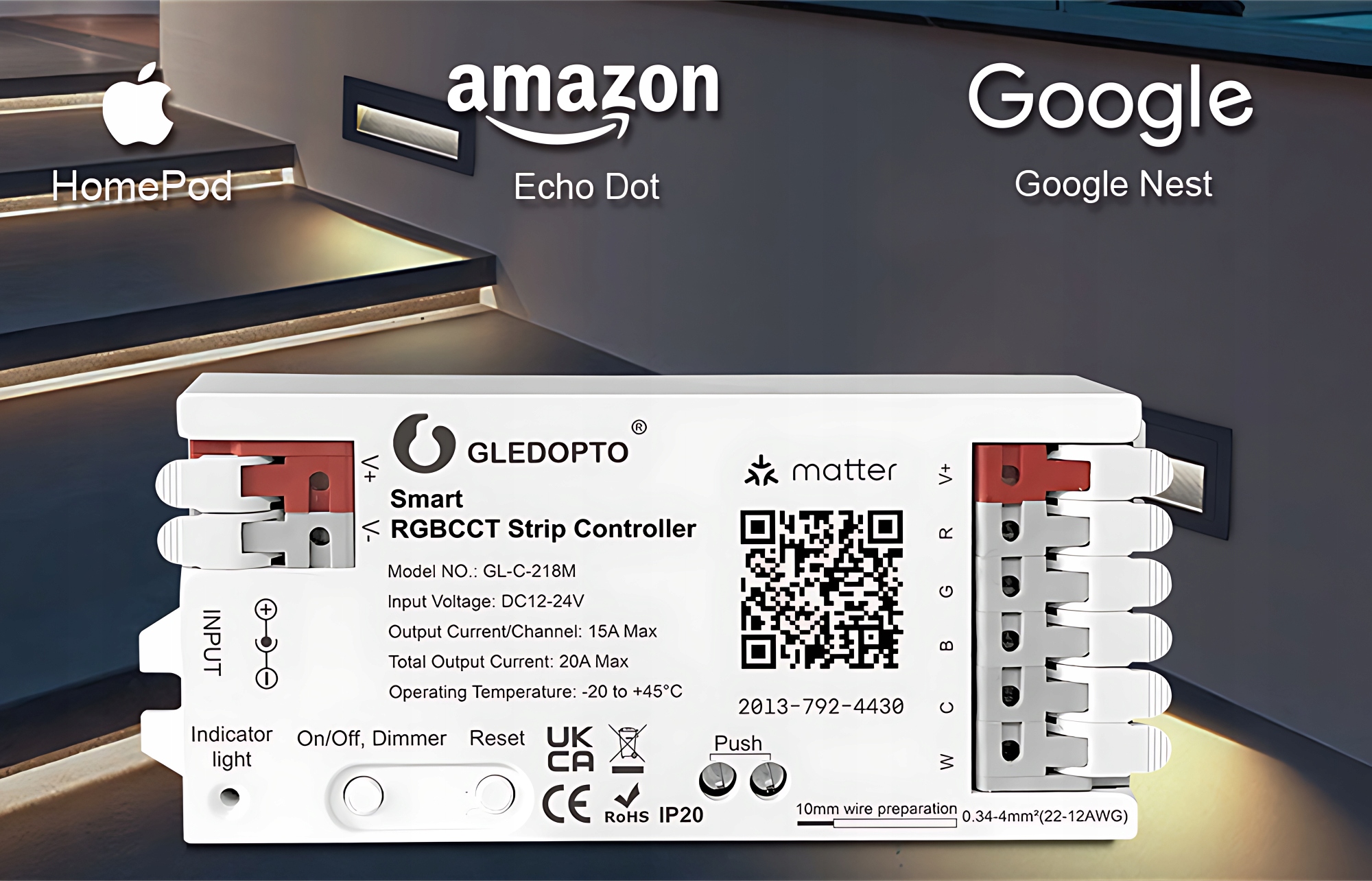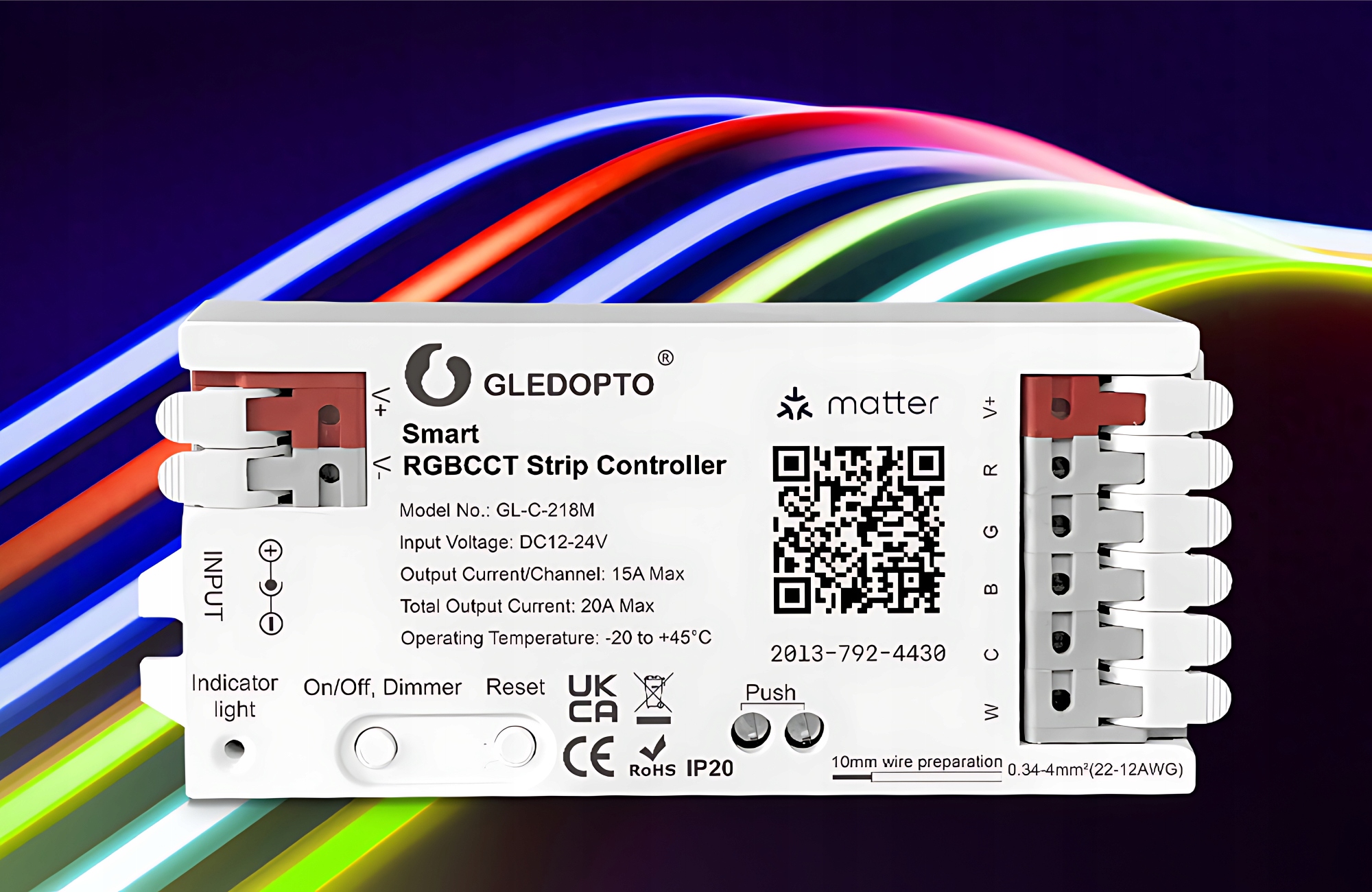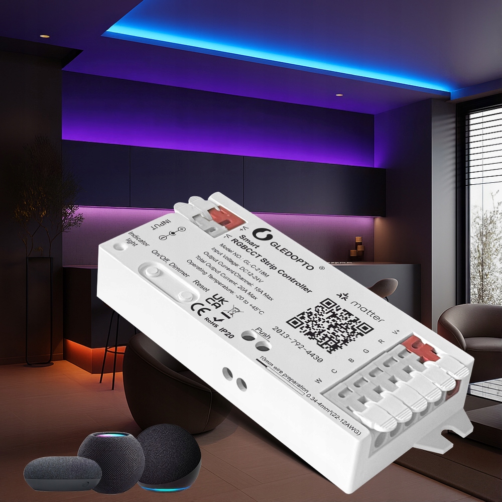 Gledopto GL-C-218M to profesjonalny sterownik do taśm i pasków LED RGB+CCT (kolory + biel ciepła/zimna), obsługujący nowoczesny standard Matter. Urządzenie pozwala sterować oświetleniem LED za pomocą smartfona, asystentów głosowych lub automatyzacji w inteligentnym domu. Dzięki wysokiej wydajności 20A obsłuży nawet długie instalacje ledowe bez utraty mocy.